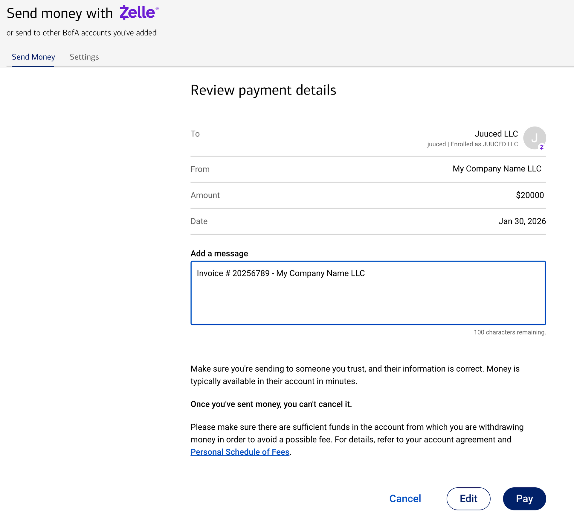 5. Important – Add a Memo: In the "Note" or "Memo" field, please type your Invoice Number & Company Name. This ensures your payment is credited to the correct project immediately.