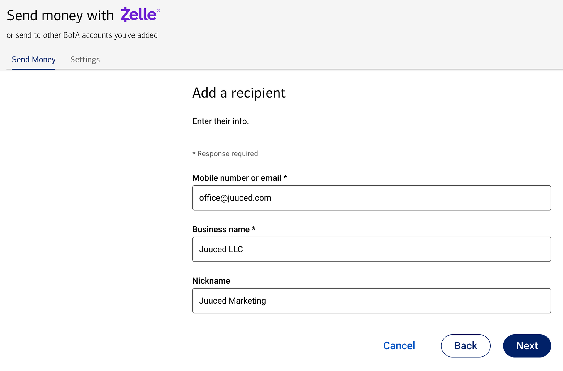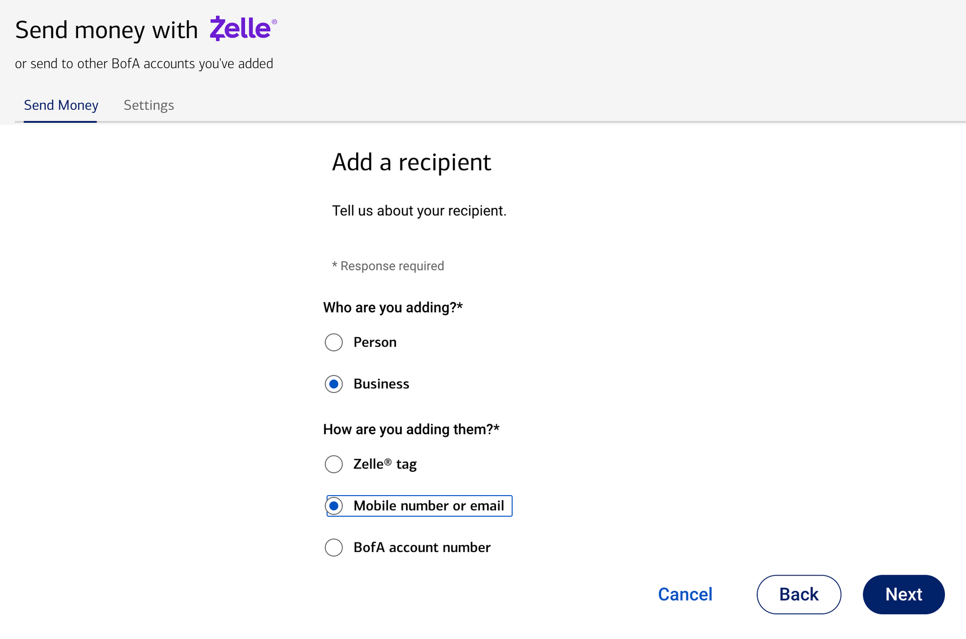 1. Select "Add Recipient": In your banking app, select the option to add a "Business" and select "Mobile number or email"